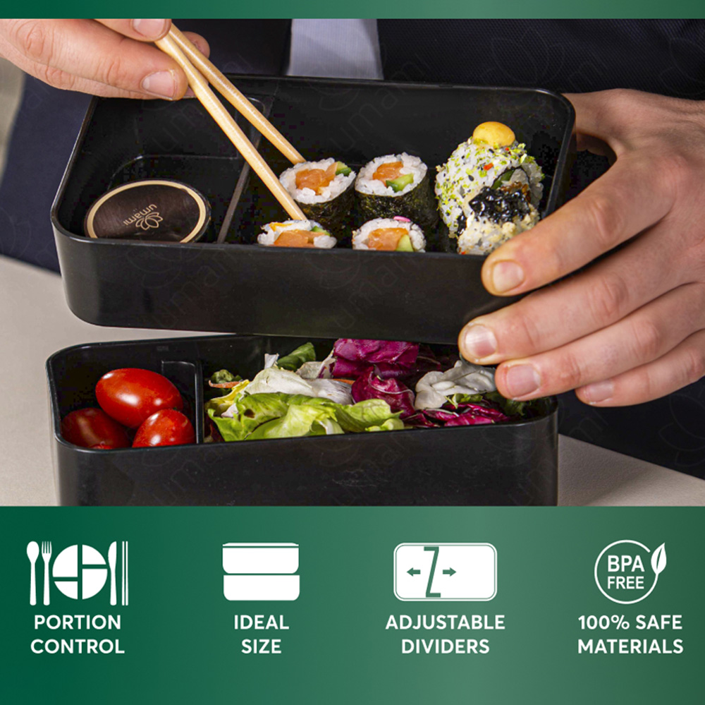 • Umami Bento boxes are designed to sustain a maximum of 3 minutes in a Microwave oven. This is enough to reheat your food. Remove the lid before heating and do not exceed 3 minutes as the high temperatures could damage the plastic.