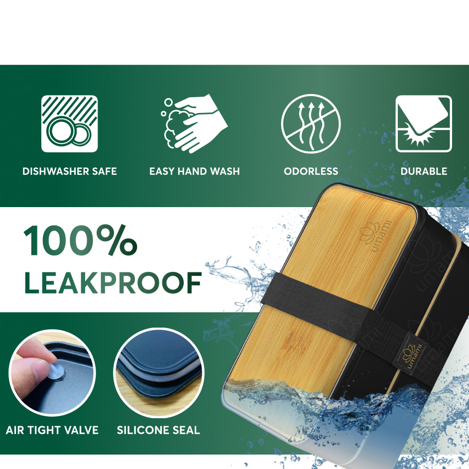 Start a journey towards a healthier lifestyle with perfect portions that satisfy without overindulgence with Umami’s Japanese bento lunch box. It's 100% leakproof—upside down, or shaken around, the airtight silicone valve and seal ensure no food or liquid ever spills from either layer of your bento box. Whether it's lunch at the office, a picnic meal, or school lunch, this ultra-portable, sustainable bento box with a bamboo lid and a full wooden cutlery set is your go-to choice for a balanced meal on the move.