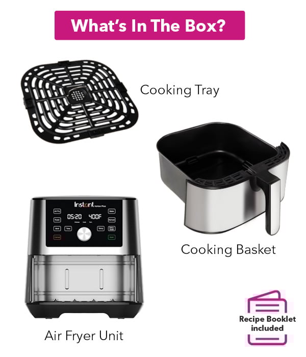 • Non-stick air fryer basket fits up to 4 portions, 600g fries, or 1.2kg chicken.